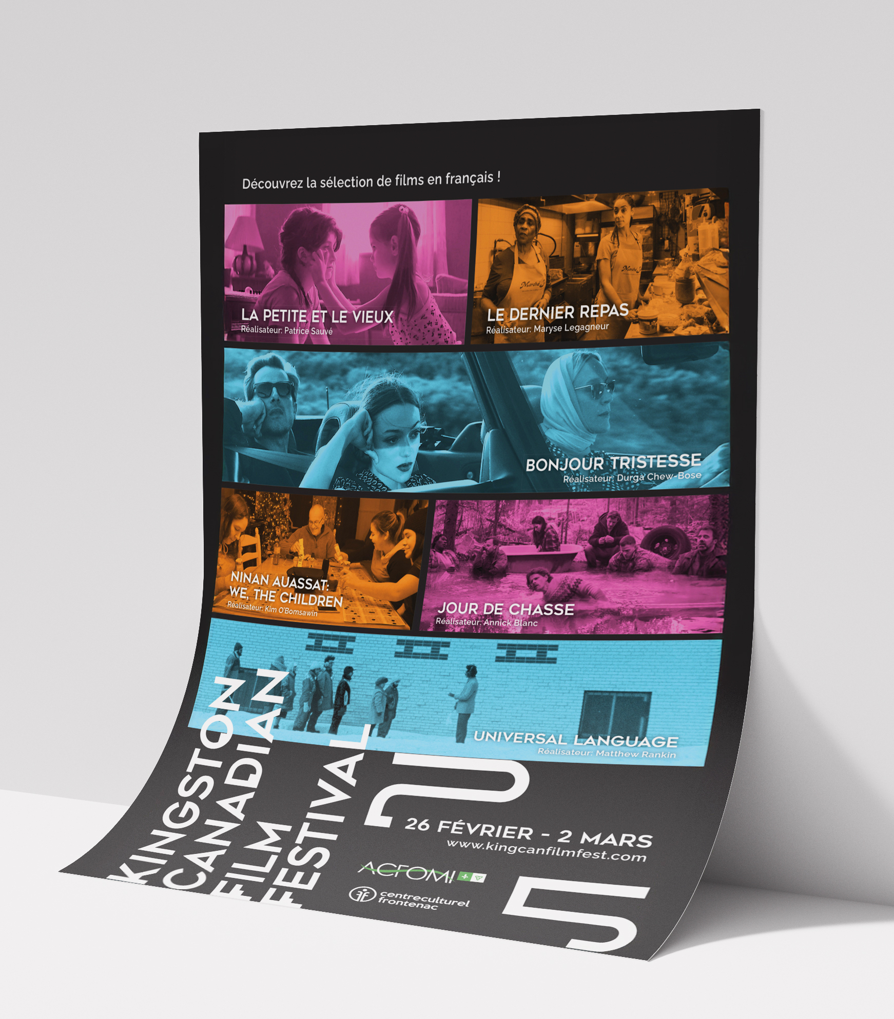 I designed the festival program guide, billboards, digital banners, and various print materials for the 25th Kingston Canadian Film Festival. All assets followed the KCFF branding guidelines and included elements from the program cover, created by a St. Lawrence College Graphic Design student, a longstanding collaboration between the film festival and St. Lawrence College.